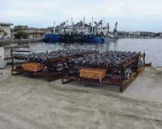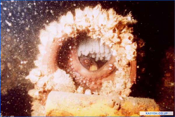 タコ型魚礁は、成長段階の異なるマダコに生息場を提供し、マダコ資源の増大を図ることを目的としており、上面は藻類の付着基質、礁の内部はクロダイ、メバル、カサゴの生息場としても役立つ構造の魚礁である。その構造は、礁内部に親ダコの産卵場と生息場を提供するために大、小2型のタコツボを配置し、沈着間もない稚ダコの隠れ場、餌場としてカキ殻餌料培養基質パネルを上面に装着した。そして幼ダコの隠れ場、餌場として内部にカキ殻よりもやや大きい空間を形成するホタテガイなどを使用したユニットを装着した。